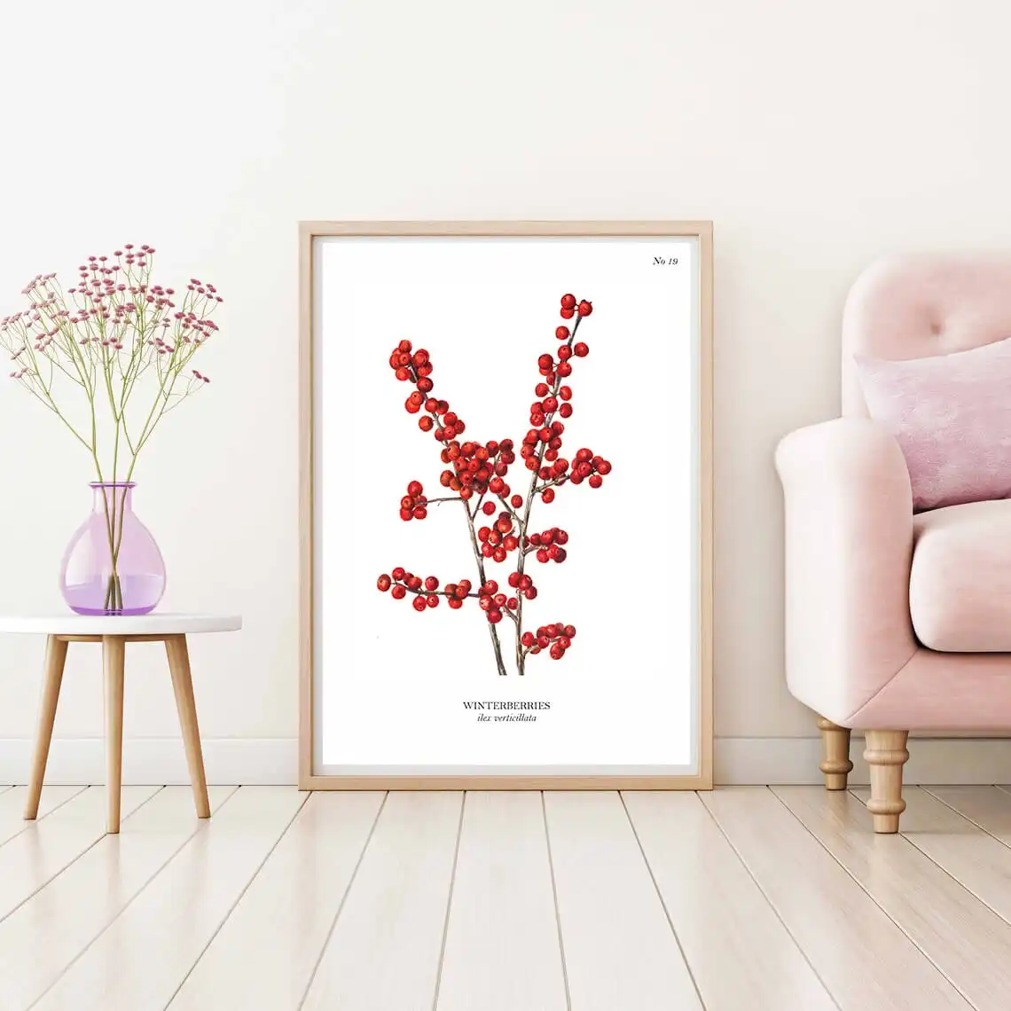 Bring the crisp beauty of winter into your home with a Winterberries (Ilex verticillata) botanical art print. This striking artwork showcases the vibrant red berries that dot the branches of the plant, creating a stunning contrast against the bare, delicate stems and muted green leaves. The Winterberries are often highlighted by the soft glow of winter light, making this piece a perfect reflection of the season’s serene elegance.